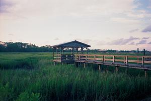 A dock on the riverside of Tybee Island sitting on top of a marsh. Photo take on Fujifilm Reala Super F cinema film.